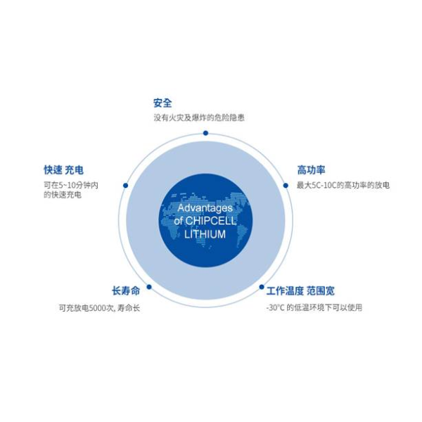 以一般的電子零件類形態而設計的,因此產品自身附有端子,可焊接到PCB上使用 其它鋰離子電池相比, Chipcell Lithium 沒有火災和爆炸的危險因素,是很安全的電池。 電視, 機上盒等家電的遙控器電源 無線鍵盤, 無線滑鼠等IT設備電源 移動醫療器械電源 多關節機器人等產業用應用領域